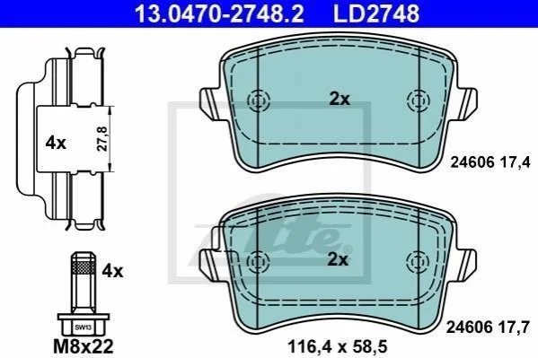 Комплект гальмівних колодок з 4 шт. дисків ATE 13.0470-2748.2 (8K0698451D, 8K0698451E, 8K0698451)