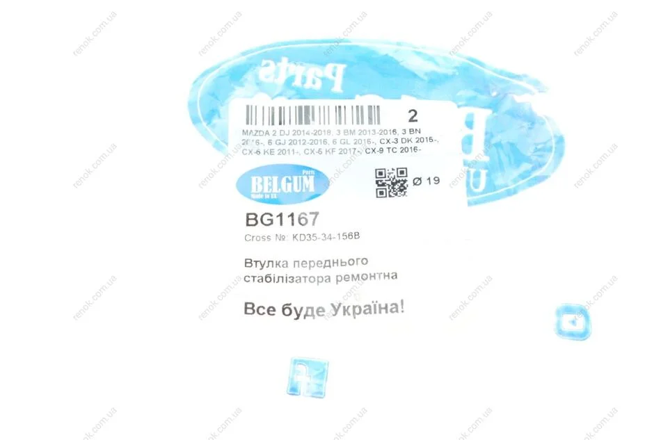 Втулка переднього стабілізатора MAZDA 2 DJ 2014-2018, 3 BM 2013-2016, 3 BN 2016-, 6 GJ 2012-2016, 6 GL 2016-, CX-3 DK 2015-, CX-5 KE 2011-, CX-5 KF 20 BELGUM PARTS BG1167