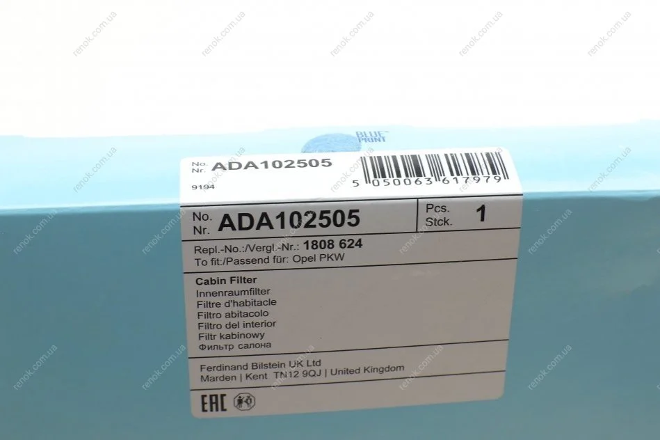 Фільтр салону Opel Combo 01- (вугільний) BLUE PRINT ADA102505 (01808624, 93172129, 093172129)