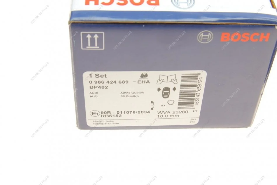 Колодки гальмівні (передні) Audi 100/A6/A8 91-02 (з датчиком) BOSCH 0 986 424 689 (4A0698151D, 4D0698151K, 4D0698151M)