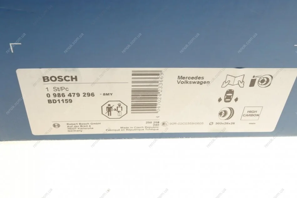 Диск гальмівний (задній) MB Sprinter 411-519CDI/VW Crafter 30-50 06- (303x28) (вент.) BOSCH 0 986 479 296 (9064230112, A9064230112, 907423010007)