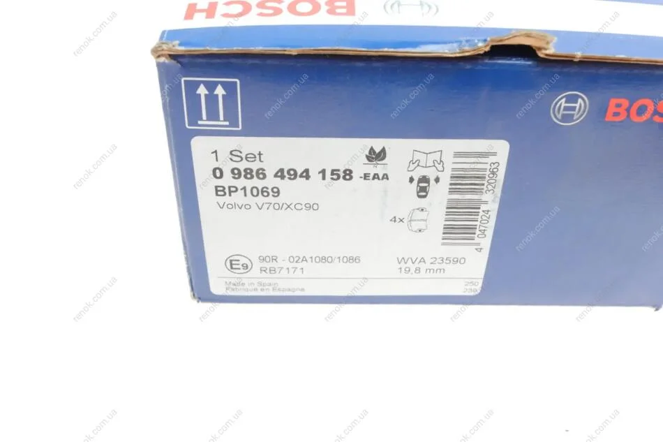 Колодки гальмівні (передні) Volvo S60 00-10/V70 01-08/S80 01-06/XC90 02-14 BOSCH 0986494158 (274285, 30769122, 30793231)