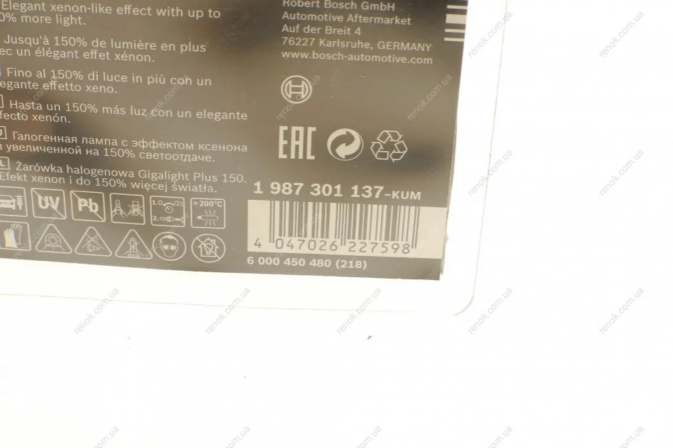 АВТОМОБІЛЬНА ЛАМПА РОЗЖАР BOSCH 1 987 301 137 (0025440094, 1607699080, 1608753380)
