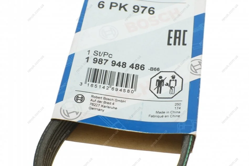 Ремінь генератора поліклиновий Peugeot Partner/307/508 02-/Citroen Berlingo/C2/C3/C4/C5 1.6 HDi 04- (6PK976) BOSCH 1987948486 (5750YQ, 5750FV, 5750YS)