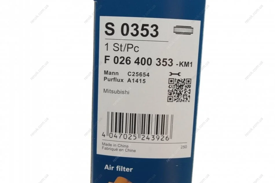 Фільтр повітряний Mitsubishi Outlander 2.0/2.4/3.0i 12-/Lancer VIII 1.6i 10-/Peugeot 4008 1.6/2.0 12- BOSCH F026400353 (1609907380, MA498, J1325050)