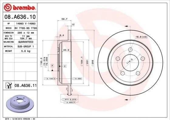 Гальмівний диск BREMBO 08.A636.10 (52128411AA, 52128411AB)