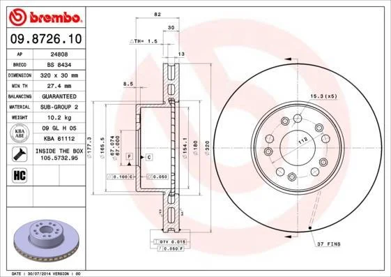 Гальмівний диск BREMBO 09.8726.10 (1404210912, A1404211012, A1404210912)