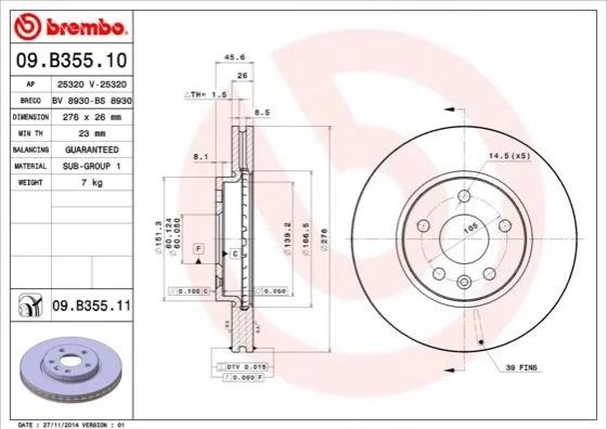 Гальмівний диск BREMBO 09.B355.11 (13502044, 13502045, 569069)