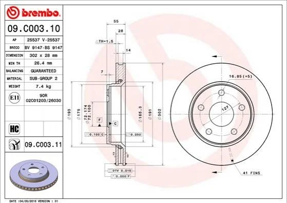 Диск гальмівний BREMBO 09.C003.11 (52060137AB)