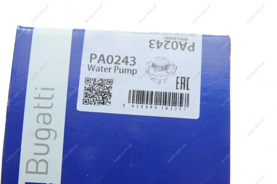 Помпа води Ford Fiesta II/III/Escort III/IV/V/VI/VII 1.3/1.4/1.6 81-00 (20z) (B/B) (8 лоп.) Bugatti PA0243 (5013320, 5020651, A840X8591BCA)