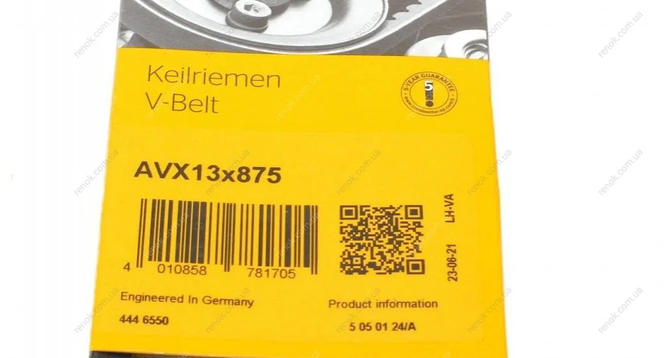 Ремінь генератора Mitsubishi L200 2.5D/TD 96-07/Pajero 3.0 97-/Iveco Daily/MB 190/VW LT 85-96 Contitech AVX 13X875 (7700720082, 0W06532611, 0049973592)