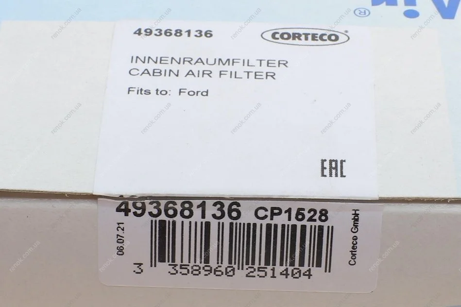 Фільтр салону Ford Mustang 2.3EcoBoost/5.0 V8 15- CORTECO 49368136 (5277386, FR3Z19N619A)