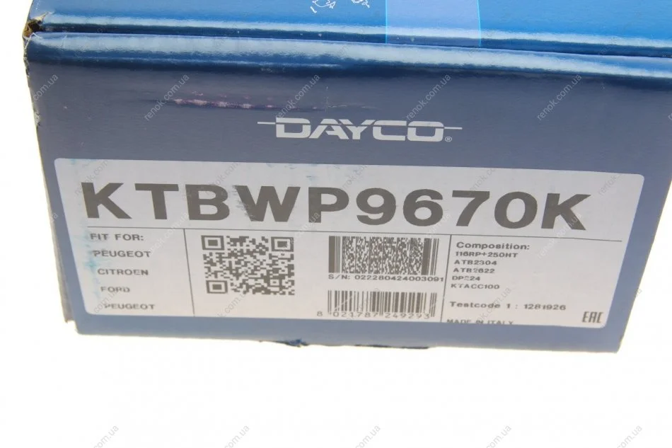 Комплект ременя ГРМ + водяна помпа DAYCO KTBWP9670K (1613561780KIT, 1761515KIT, 1855735KIT)