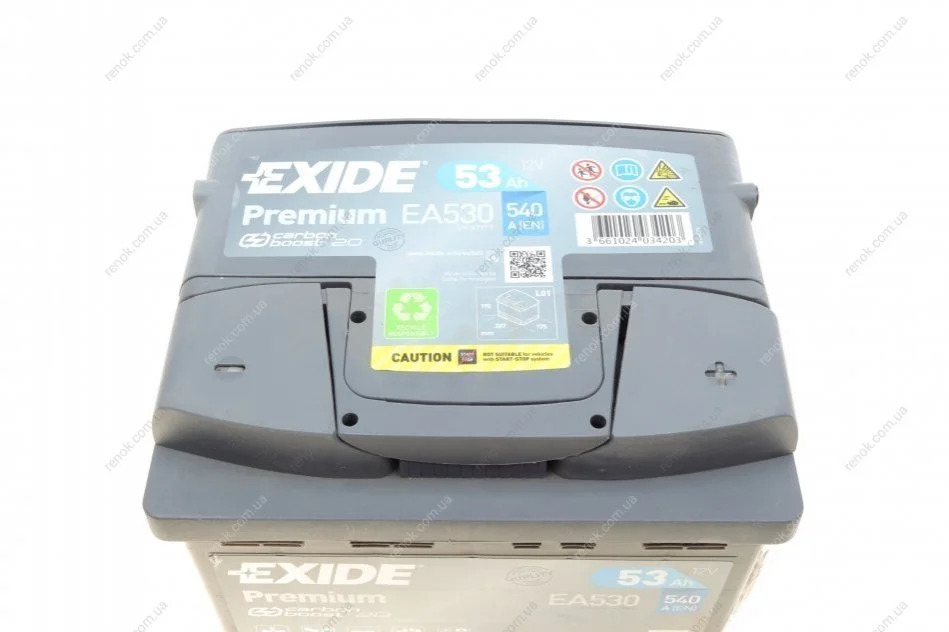 Акумулятор Premium (207×175×190), 53Ач, 540А, R+ EXIDE EA530 (7711238596, 7711222779, 8200377257)