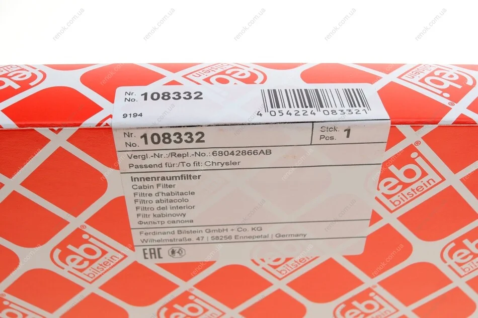 Фільтр салону Chrysler Grand Voyager 2.8CRDI/3.6 24V 07- FEBI BILSTEIN 108332 (278913YF0A, 278913YF1A, K68042866AA)