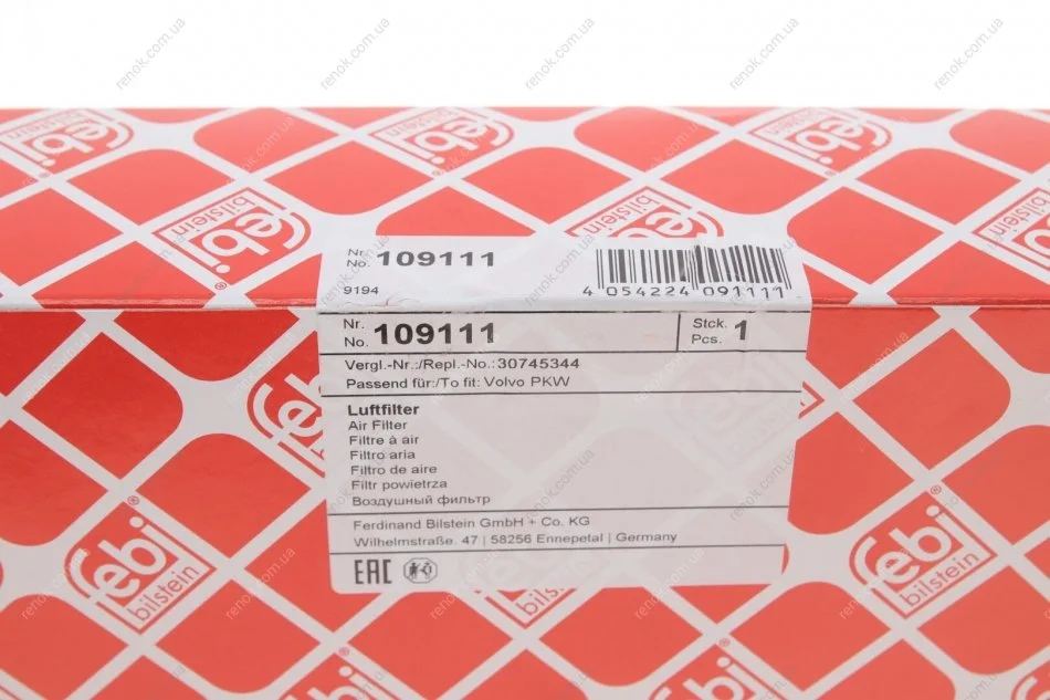 Фільтр повітряний Volvo S60 10-18/S80 /V70 /CX70 3.0-3.2 06- FEBI BILSTEIN 109111 (30745344)