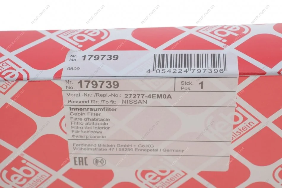 Змінний фільтруючий елемент повітряного фільтра салону FEBI BILSTEIN 179739 (272772621R, 272775340R, 272774BA0A)