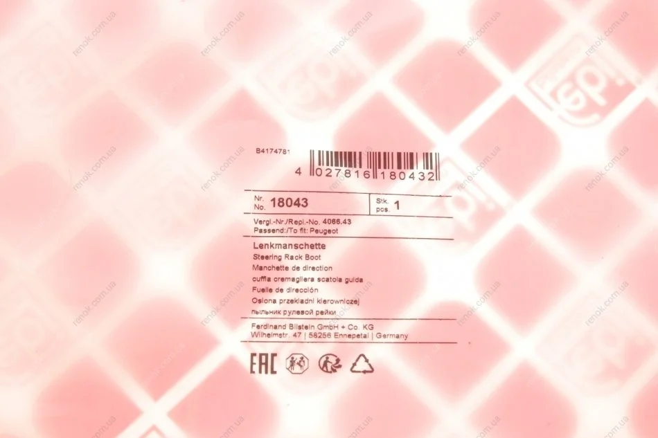 Пильник рейки рульової Citroen Berlingo/Peugeot Partner 96-08 (L) FEBI BILSTEIN 18043 (406643)