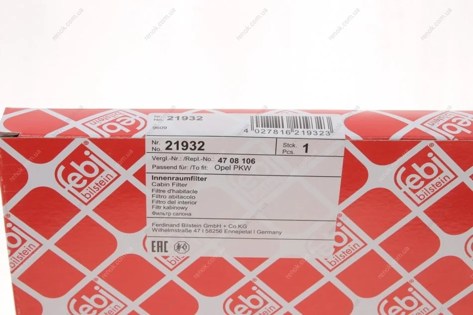 Фільтр салону Opel Agila/ Suzuki Ignis/ Subaru Justy 00- FEBI BILSTEIN 21932 (04708106, 04705463, 09196805)