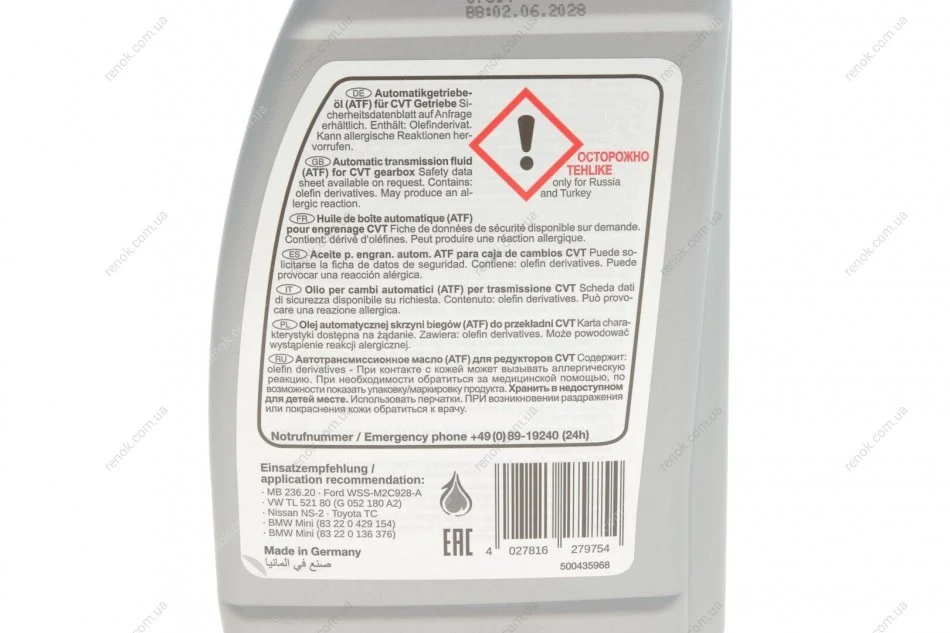 Дозвіл виробника: ZF 6HP19. 6HP21., 6HP26. 6HP28., 6HP32. 6HP34., BMW 83220144137., ATF M1375.4., 83220142516., FORD, MERCON SP XT-6-QSP, (6R60. 6R75. 6R80)., Jaguar C2C 8432., Land Rover, TYK50 0050., VW/AUDI, G 055005 A1/A2/A6., ZF S671 090 252/3/5