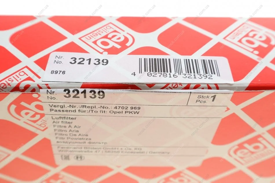 Фільтр повітряний Opel Agila 1.0/1.2i 00-08 FEBI BILSTEIN 32139 (04702969, 1378083E00000, 1378083E00)