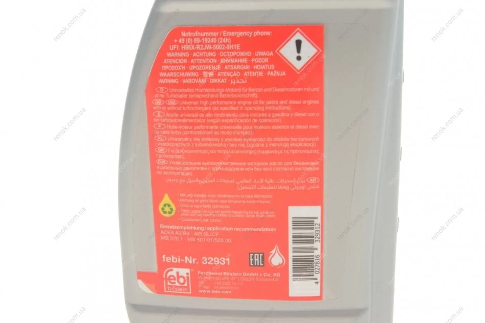 Олива 10W40 (1л) (VW 501 01/505 00/MB 229.1) FEBI BILSTEIN 32931