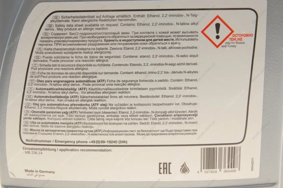 Специфікація: ATF4134, MB 236.14, ATF III H plus
