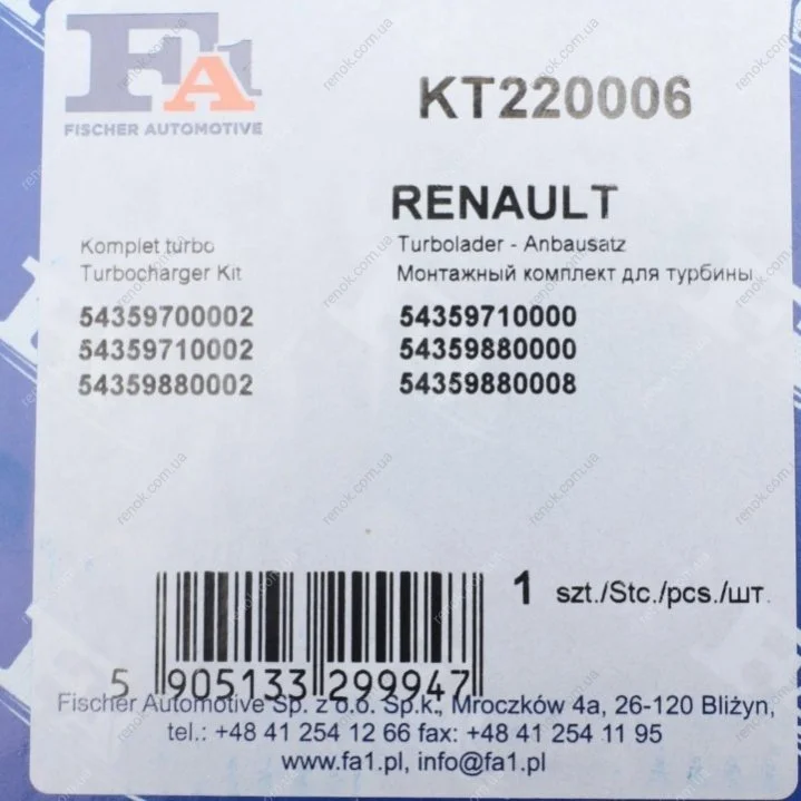Монтажний комплект, компресор турбонаддува OPEL/RENAULT 1.5DCI K9K700-01-(Fisher) Fischer Automotive One (FA1) KT220006