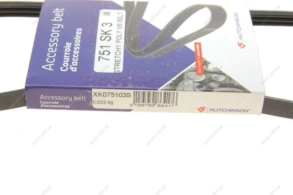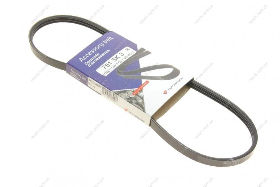 Ремінь генератора Renault Clio IV 1.2 16 12- (3PK751) HUTCHINSON 751 SK 3 (117200033R, 117207719R)