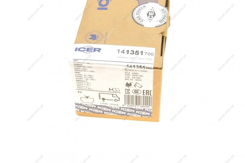 Колодки гальмівні (задні) Renault Trafic/Opel Vivaro/Nissan Primastar/Interstar 01-/NV300 16- ICER 141351-700 (7701050918, 440607337R, 440607091R)