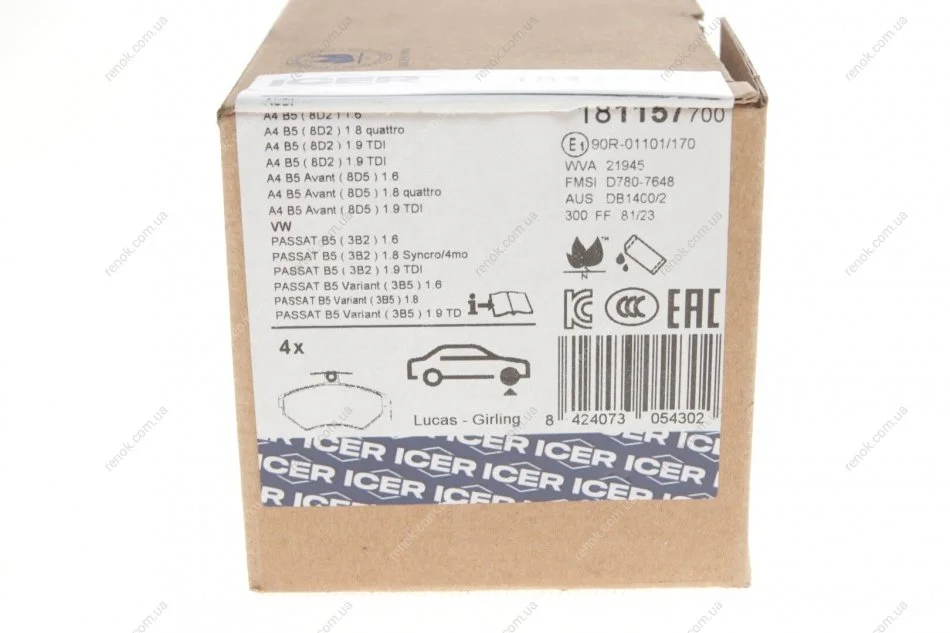 Колодки гальмівні (передні) Audi A4 94-01/VW Passat B5 96-00 ICER 181157-700 (32326050NSL, 8E0698151, 8E0698151A)