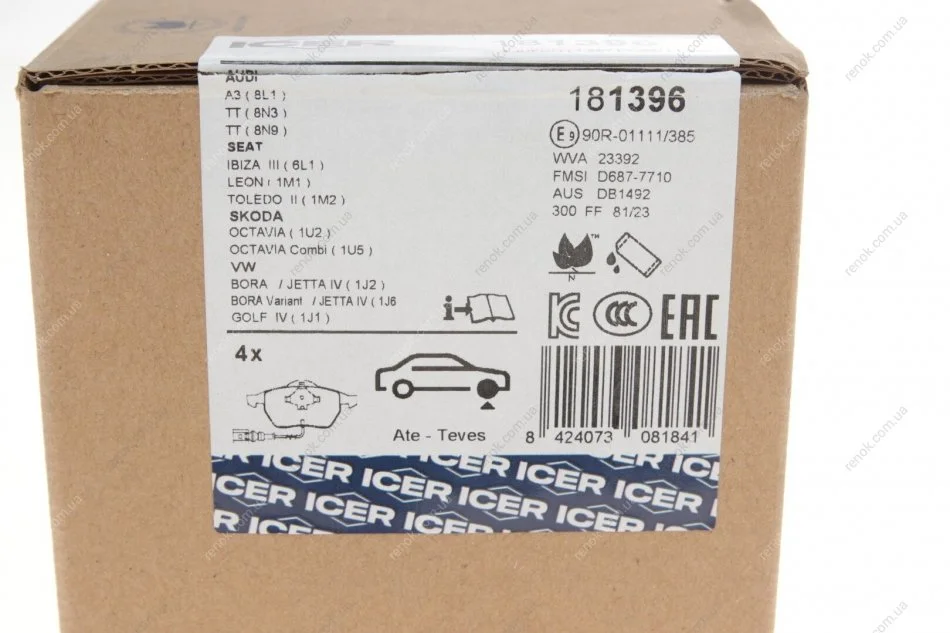 Колодки гальмівні (передні) Audi A3/TT/Seat Leon/Skoda Octavia/VW Golf 96-10/Polo 05-09 (+датчик) ICER 181396 (1J0698151K, 1J0698151M, 8N0698151A)