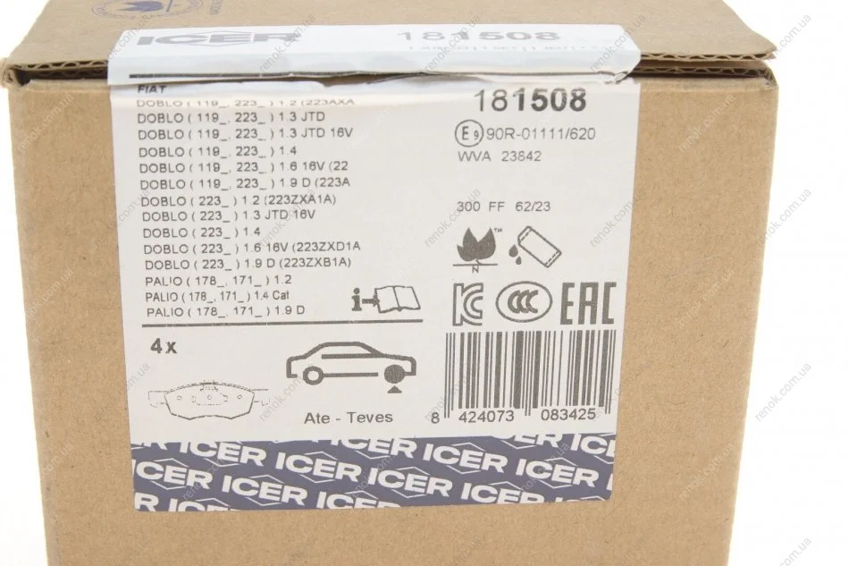 Колодки гальмівні (передні) Fiat Doblo 01-/Palio 96- ICER 181508 (77363496, 77362205, 9948870)