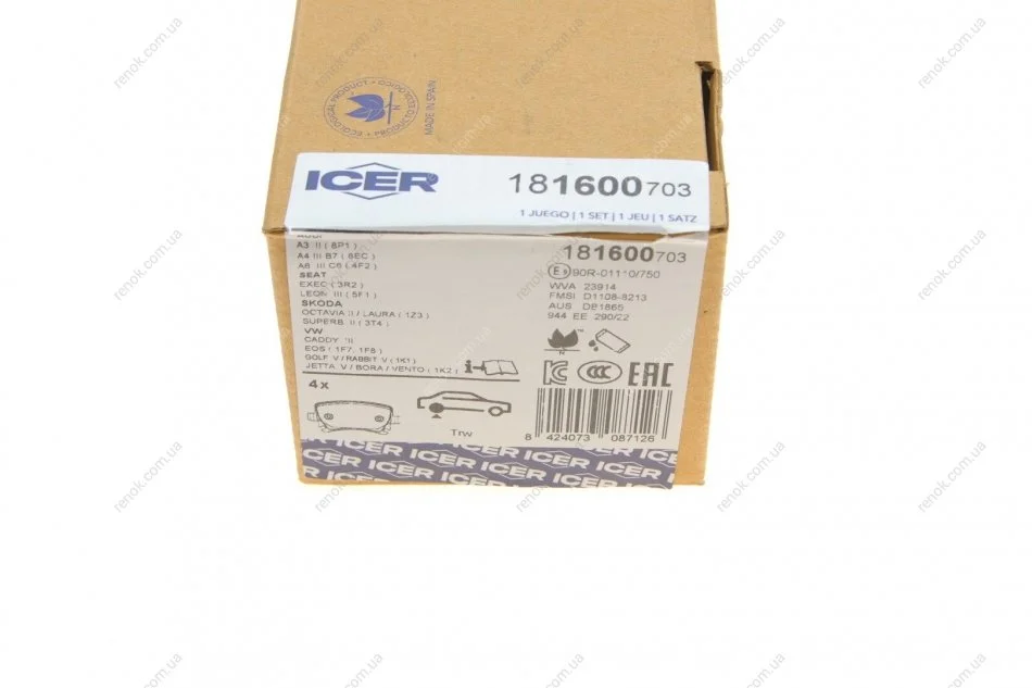 Колодки гальмівні (задні) Audi A3/A4/A6/VW Caddy/Touran 04-15/Golf/Passat/Skoda Octavia 03-/SuperB ICER 181600-703 (8660004486, 8671016750, 1K0698451)