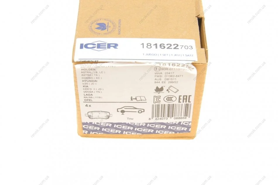 Колодки гальмівні (задні) Opel Combo/Astra/Corsa/Meriva/Zafira 98-/Hyundai ix20/Kia Venga/Cee'd 10- ICER 181622-703 (8660004467, 8671016663, 1605086)