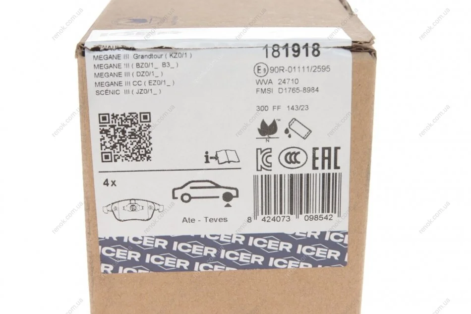 Колодки гальмівні (передні) Renault Megane III/Laguna III/Scenic III 08-/Clio 13- (WVA 24710/24826) ICER 181918 (440608746R, 410607369R, 410600629R)
