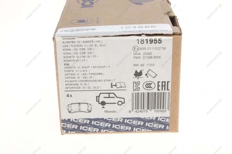 Колодки гальмівні (задні) Hyundai Tucson 15-/Sonata 05-15/ix20/ix35/Kia Cerato/Sportage/Picanto 10- ICER 181955 (583021YA00, 58302BVA05, 58302BVA30)