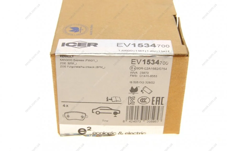 Колодки гальмівні (передні) Renault Kangoo Z.E. 11-/Zoe 12- ICER EV1534-700 (410601817R, 410604076R, 410604775R)