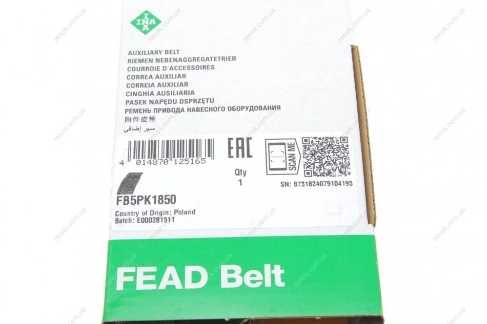 Ремінь генератора BMW 5 (E39)/7 (E38) 2.5TDS 96-04/Kia Cerato/Rio/Hyundai Accent 1.5/1.6CRDI 05- (5PK1850) INA FB 5PK1850 (252122A112, 11282245028, 252122A111)