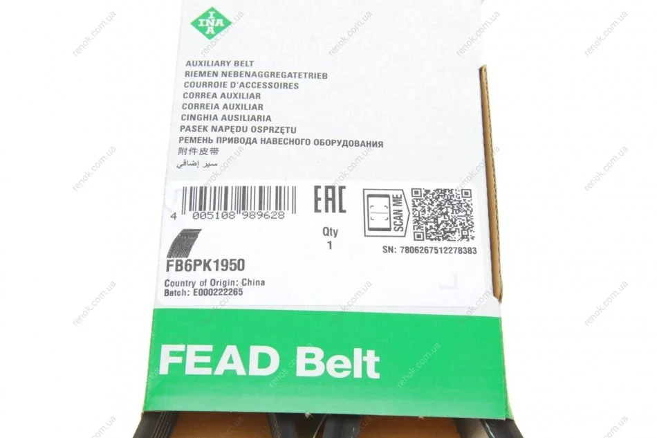 Ремінь генератора Renault Espace/Laguna 2.2dT 93-01 (6PK1950) INA FB 6PK1950 (117205CA0A, 7700859638, 7701064342)