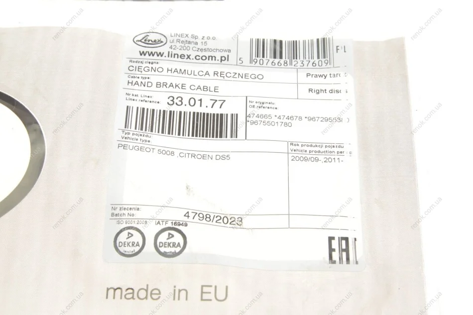 Трос ручника (задній) (R) Citroen C3/Peugeot 5008 09- (970/784mm) LINEX 33.01.77 (474678, 9672955380, 9675501780)