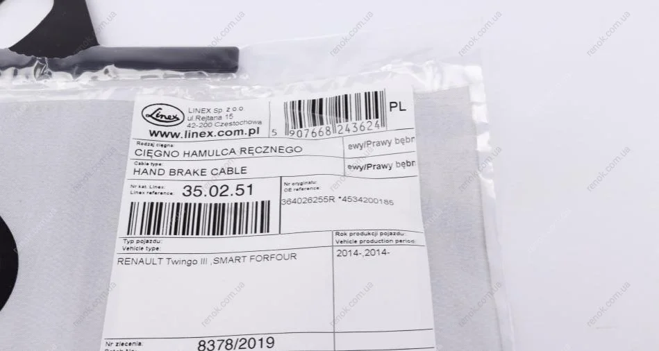 Трос ручника (задній) Renault Twingo/Smart Fortwo (1855/755mm) LINEX 35.02.51 (364026255R, 4534200185)