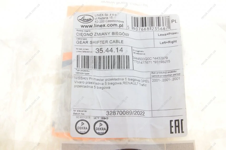 Трос куліси Renault Trafic/Opel Vivaro 1.9DCI-2.5DCI LINEX 35.44.14 (3444500Q0C, 4432979, 7701477671)