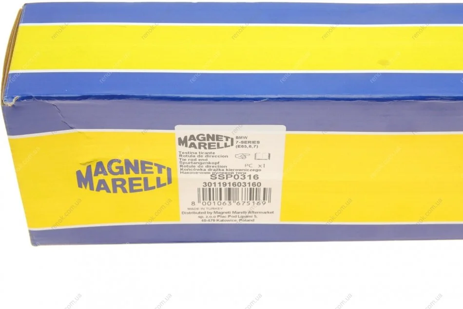 Наконечник тяги рульової BMW 5 (E60/E61) 03-10/ 7 (E65-E66) 02-08 M54/M57/N46/N52/N53/N54/N62 (SSP0316) MAGNETI MARELLI 301191603160 (32106774361, 32106776946, 32216756369)
