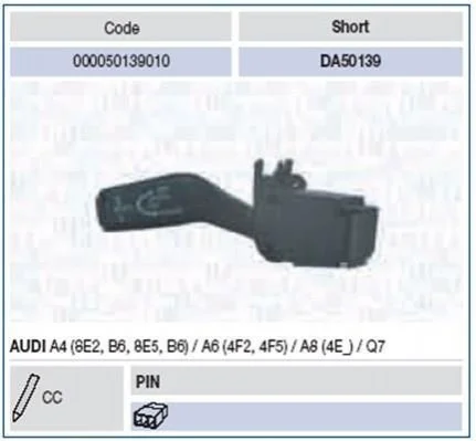 Перемикач на рульової колонці AUDI A4 1.6,1.8,1.9,2.0,2.4,2.5,3.0,S4,A6 2.0,2.4,2.7,3.0,3.2,4.2,A8 3.0,3.2,3.7,4.0,4.2,6.0,Q7 3.0, [00005013 MAGNETI MARELLI DA50139 (4E0953521, 4E09535214PK, 4E0953521B)
