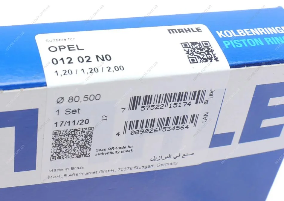 Кільця поршневі Opel Vectra 1.8i 95- (80.50mm/STD) (1.2-1.2-2) MAHLE / KNECHT 012 02 N0