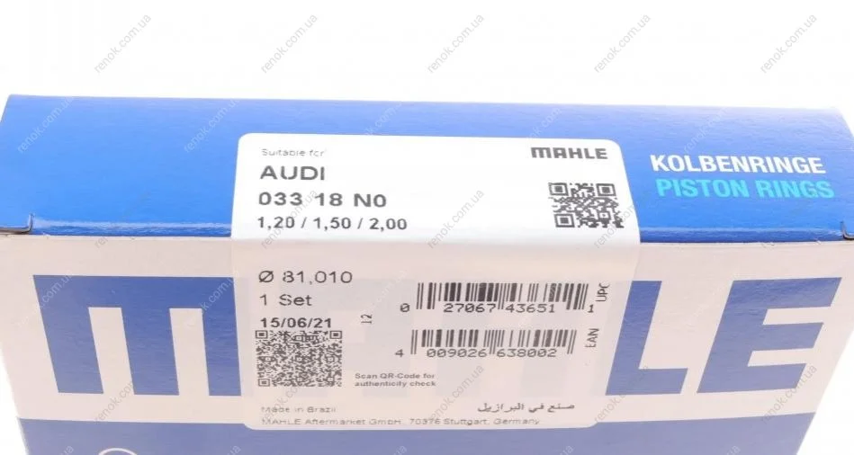 Кільця поршневі Audi A6 2.4 04-08 (81.01mm/STD) (1.2-1.5-2) MAHLE / KNECHT 03318N0 (06E107301J, 06E107311, 06E107321A)
