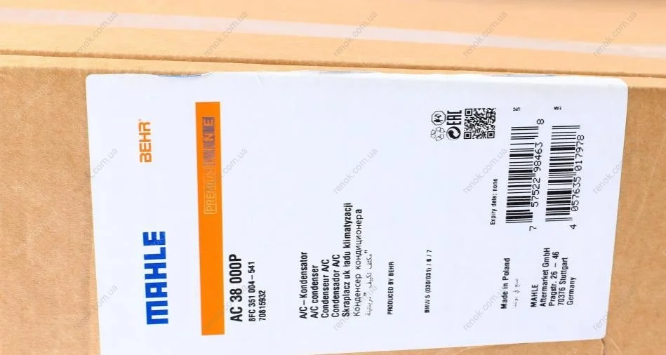 Радіатор кондиціонера BMW 5 (F90/G30/G31)/6 (G31)/7 (G11/G12)/8 (G14/F91) 2.0D/3.0D 15- MAHLE / KNECHT AC 38 000P (64539364258, 9364258)