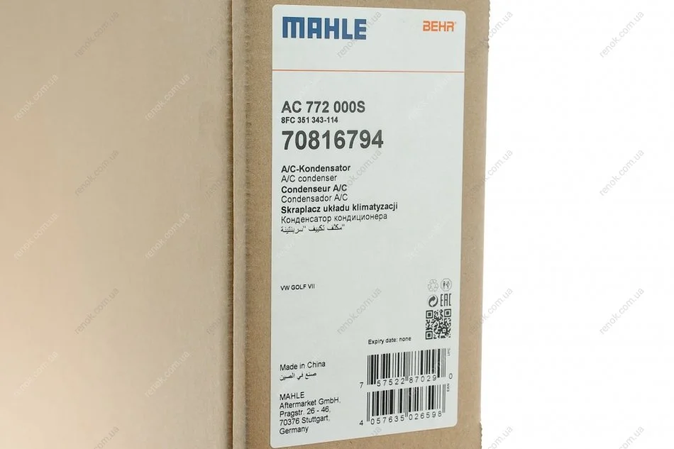 Радіатор кондиціонера MH MAHLE / KNECHT AC 772 000S (5Q0816411AA, 5Q0816411AM, 5Q0816411BF)