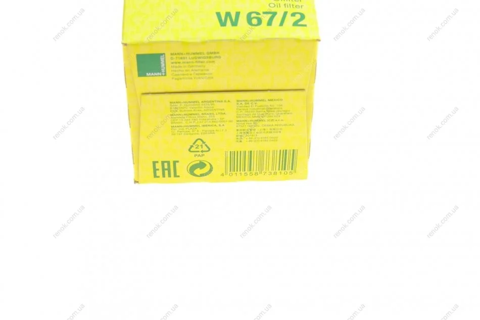 Фільтр масляний Chevrolet Aveo 1.2/Chery QQ 0.8 04-12/Suzuki Swift 1.0-1.6 83-/Daewoo 0.8-1.0 98- MANN W 67/2 (152084A00A, 1651082702, 152084A00E)